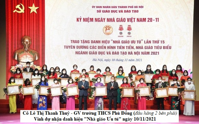 Ngày 10.11.2021, cô giáo Lê Thị Thanh Thủy vinh dự được đón nhận danh hiệu “Nhà giáo ưu tú”. Đây không chỉ là niềm vui cá nhân mà còn là niềm tự hào của tập thể các thầy cô giáo đang công tại trường THCS Phù Đổng. Với danh hiệu cao quý mà Chủ tịch nước trao tặng, nhà giáo ưu tú Lê Thị Thanh Thủy, cũng như tập thể cán bộ giáo viên nhà trường sẽ tiếp tục cống hiến nhiều hơn nữa cho sự nghiệp Giáo dục và Đào tạo, đảm đương tốt nhiệm vụ giảng dạy, kế tục truyền thống và sự nghiệp “Trồng người” cao quý mà các thế hệ nhà giáo đã dày công xây dựng.